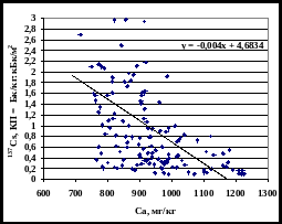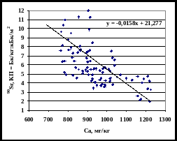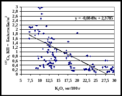 | КП 137Cs = -0,004Са + 4,68 | R2 = 0,423 | КП90Sr = -0,32К2О + 11,94 | R2 = 0,476 |