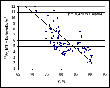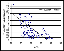 | КП 137Cs = -0,12V + 10,86 | R2 = 0,449 | КП90Sr = -0,43V + 40,80 | R2 = 0,518 |