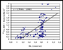 | КП 137Cs = -4,68Иок + 4,47 | R2 = 0,384 | КП90Sr= 5,99Hг - 3,23 | R2 = 0,410 |