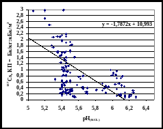 | КП 137Cs = - 1,79 pH + 10,99 | R2 = 0,384 | КП90Sr = -16,91 Иок + 19,18 | R2 = 0,462 |