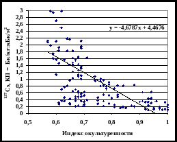 | КП 137Cs = 7,50 - 0,97pH - 0,00003 Ca - 0,036 P2O5 | R2 = 0,436 | ||