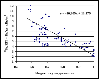 Величина коэффициентов перехода 90Sr в урожай многолетних злаковых трав определяется теми же свойствами, что и величина перехода 137Cs: степенью насыщенности основаниям, V (r = - 0,72), содержанием обменного Са (r = - 0,70), содержанием обменного К2О (r = - 0,69), индексом агрохимической окультуренности почвы (r = - 0,68), величиной гидролитической Нг (r = 0,64), и обменной кислотности рН (KCl (r = - 0,63).
