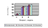 Как показали исследования, с возрастом несушек увеличивается масса яиц во всех группах (рис. 1), но наиболее высокой она была в первой и третей опытных группах во все возрастные периоды и находилась в пределах от 47,5 до 63,4 г: В 48-недельном возрасте разница по массе яиц между контрольной и опытными группами составила в первой группе – 2,68%, во второй – 0,08%, в третей – 2,85% в пользу опытных. В наших исследованиях установлено положительное влияние скармливания курам экспериментальной белково-минеральной добавки на толщину скорлупы. С 21 и до 38-недельного возраста яйценоскости толщина скорлупы яиц у кур опытных групп достоверно повысилась, а с 48-недельного несколько снизилась во всех группах. При изучении соотношения составных частей яйца определена удельная масса желтка, которая во всех группах в среднем составляла 50% от массы белка, но в опытных группах она была несколько выше. В возрасте 34-х недель в период их наиболее интенсивной яйценоскости был проведен балансовый опыт (табл. 4).