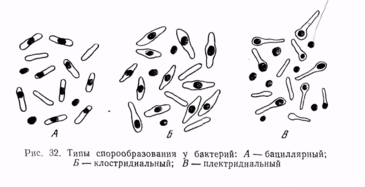 При, рассмотрении препаратов живых бактерий споры довольно легко различить, так как они сильно преломляют свет. При обычных способах окраски споры не прокрашиваются или окрашиваются очень слабо и имеют вид светлых включений на фоне окрашенной плазмы. Для окраски спор препарат обрабатывают концентрированными растворами красителей с протравами при нагревании (стр. 130). Чтобы установить расположение споты в клетке, добиваются контрастного окрашивания споры и остальной части клетки.