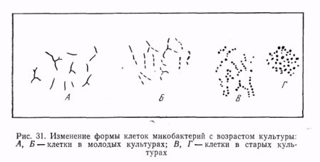 Для микобактерий характерно более или менее выраженное ветвление клеток. Оно обнаруживается в основном в молодых культурах и при развитии на определенных средах. У некоторых видов ветвящихся клеток очень немного. С возрастом клетки большинства видов распадаются на овальные образования. Расположение этих структур часто повторяет очертания ранее существовавших палочек. У некоторых видов такой распад наблюдается уже через несколько часов после пересева в свежую питательную среду. Эти микроорганизмы в последнее время относят к роду Arthrobacter. В старых культурах многие микобактерий образуют покоящиеся клетки – артроспоры, с утолщенной оболочкой и более плотной плазмой. Кокковидные и покоящиеся клетки при пересевах на новую среду прорастают в палочки. Обособление делящихся клеток микобактерий происходит по снэппинг-типу.