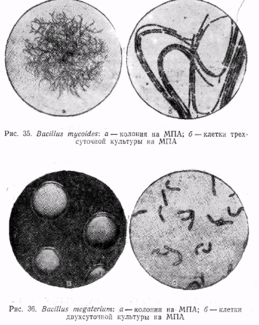 Вас. subtilis – колонии сухие, бесцветные или серовато-белые, мелкоморщинистые или образующие бархатистый налет, расплывающиеся по поверхности агара и тогда имеющие по краям складки; край более или менее волнистый; плотно прилегают к агаровой среде. Палочки короткие и тонкие 3–5×0,6 мкм; нередко соединены в длинные нити. Споры овальные 0,9×0,6 мкм, расположены без строгой локализации – эксцентрально или ближе к центру, но не строго центрально.