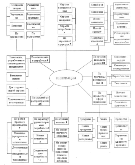 1.1.радикальные инновации 1.2. улучшающие инновации 2. масштаб новизны инновации: 2.1. инновации, новые в мировом масштабе 2.2. инновации, новые в республике 2.3. инновации, новые для отрасли в республике 2.4. инновации, новые для предприятия 3. характер инновации: 3.1. продуктовые инновации 3.2. процессные инновации 3.3. организационные инновации 3.4.экономические инновации 3.5. социальные инновации 4. частота применения инновации: 4.1 разовые инновации 4.2. повторяющиеся инновации 5. сфера народного хоз-ва, где внедряется инновация: 5.1. материальное производство 5.2. наука 5.3.сфера услуг  |    6. область применения инновации: 6.1. инновации для внутреннего применения на предприятии 6.2. инновации для накопления на предприятии 6.3. инновации, предназначенные для продажи 7. форма инновации: 7.1. открытия, изобретения, патенты 7.2.рационализаторские предложения 7.3. ноу-хау 7.4. товарные знаки, торговые марки, эмблемы 7.5. новые документы, описывающие технологические, производственные, управленческие процессы, конструкции, структуры, методы 8. вид эффекта, получаемого в результате внедрения инновации 8.1. экономический 8.2. экологический 8.3. научно-технический 8.4. социальный 8.5. интегральный  |
