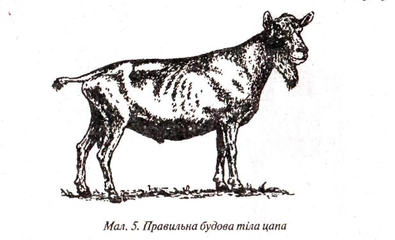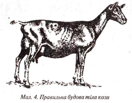 Визначаючи розвиненість тіла кози, необхідно враховувати цілу низку ознак: довжина і глибина тулуба, розвиненість грудної клітки, кут, під яким розташовані ребра. Ідеальна форма тіла тварини — клиноподібна, така, що розширюється від передньої частини до задньої (мал. 4 і 5).