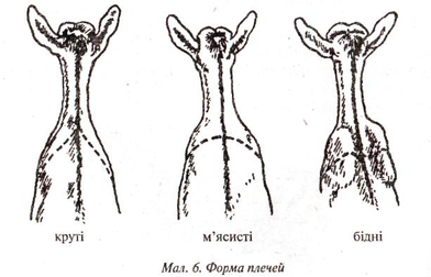 Шия має бути довгою й сухою, плечі—трохи кутастими (мал. 6). Бідні плечі - погана ознака.