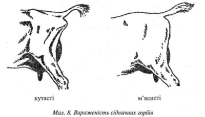 Форма сідничних горбів та їх вираженість — іще одна важлива ознака конституції тварини (мал. 8). Якщо планують розробляти молочний напрям продуктивності, то вибирають тварину з кутастими сідничними горбами, якщо м'ясний — з м'ясистими.