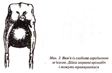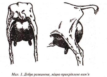 Вим'я повинне бути добре прикріплене до тулуба, високо розташоване, з достатньо широкою основою, з чітко вираженою і міцною серединною зв'язкою (мал. 1).