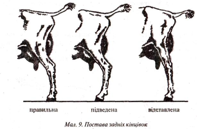 Постава задніх ніг також має велике значення. Зближення задніх кінцівок призводить до постійного здавлювання вим'я, через це у кіз ще у молодому віці виявляються порушення його прикріплення. Зближення задніх кінцівок у дшянні скакальних суглобів спричиняє підштовхування вим'я при пересуванні, через це вим'я може травмуватися. Правильна постава задніх кінцівок кози — на мал. 9.
