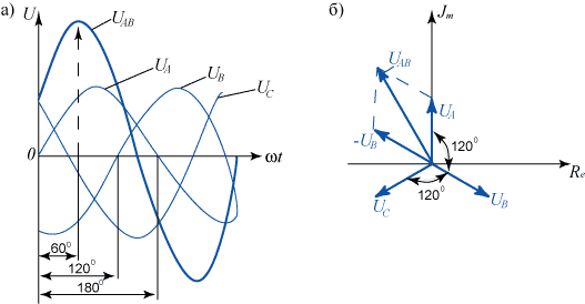 Графики а) и векторная диаграмма б) фазных и одного линейного напряжения.
