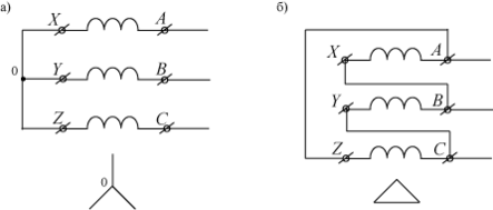 Практически используются две схемы симметричных соединений трёх фаз: звезда (рис. 2а), когда соединяются вместе концы всех обмоток X, Y, Z, и треугольник (рис. 2б), когда соединяются начало одной обмотки с концом другой в последовательности A – Z, B – X, C – Y.