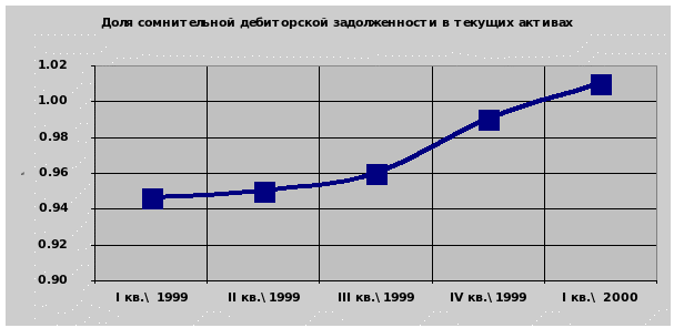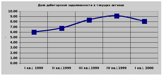 По таблице видно, что доля дебиторской задолженности в текущих активах увеличивается : в I квартале она составила- 6%, во II квартале- 6,8%, в III квартале- 8,4%, и IV квартале – 9,2%, а в I квартале 2000 года отмечается снижение-8,1%