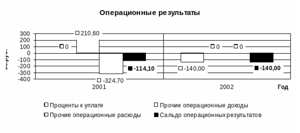 На рисунке 2.3 показано влияние и состав операционных результатов на балансовую прибыль предприятия. Данные за 2001 год опущены, так как операционные результаты и их составляющие были равны нулю. В 2002 году прочие операционные доходы составили 210,6 тыс. рублей, прочие операционные расходы составили 324,7 тыс. рублей. Проценты к уплате равны нулю. Сальдо операционных результатов получилось отрицательным и равно -114,1 тыс. рублей. За 2003 год наоборот, прочие операционные доходы и расходы равны нулю, а проценты к уплате составили 140 тыс. рублей. Отсюда и сальдо операционных результатов за 2003 год равно процентам к уплате и составляют -140 тыс. рублей.