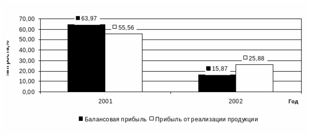 Если в 2002 году темп роста прибыли от реализации продукции и темп балансовой прибыли свидетельствуют о спаде в работе предприятия, то эти показатели за 2003 год показывают катастрофическое положение. Причем, в 2002 году темп роста балансовой прибыли оказывается выше темпа роста прибыли от реализации продукции, 63,97 % и 55,56 % соответственно. Это связано со значительным уменьшением себестоимости с 5389,1 тыс. руб. в 2001 году до 3793,2 тыс. руб. в 2002 году. В 2003 году темп роста прибыли от реализации продукции выше темпа роста балансовой прибыли, 25,88 % и 15,87 % соответственно.