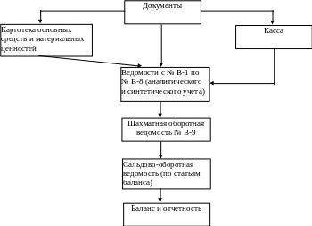 Все ведомости, кроме ф. № В-9, заполняются на основе первичных учетных документов с формированием оборотов по дебету и кредиту счетов в корреспонденции с другими счетами. Затем их данные переносятся в шахматную оборотную ведомость. Данные в ней записываются на пересечении двух показателей, характеризующих две величины, а именно дебетуемый и кредитуемый счета, взаимосвязанные и взаимозависимые друг от друга.
