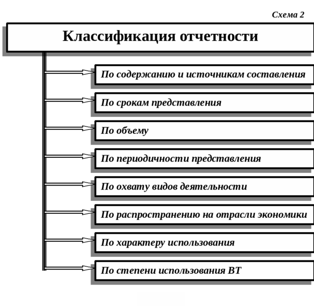 целях упорядочения и облегчения составления отчетность классифицируется по следующим основным признакам (смотри схему 2):