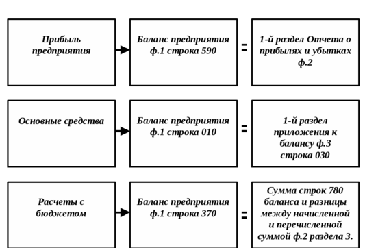 Кроме того, определяют, насколько согласуются показатели, получившие отражение в различных формах отчетности и внутри этих форм. Связи между отдельными отчетными формами выражают взаимосвязь данных синтетического и аналитического учета, а также являются следствием двойной записи на счетах. Например, прибыль или убыток в балансе предприятия (ф. 1) соответствует этому показателю в Отчете о прибылях и убытках (ф. 2). Первый раздел приложения к балансу (ф.3) должен увязываться с балансом (ф.1), т.е. сведения о наличии основных средств на начало и конец года, приведенные в форме 3 (строка 030), должны равняться данным баланса формы 1 (строка 010).
