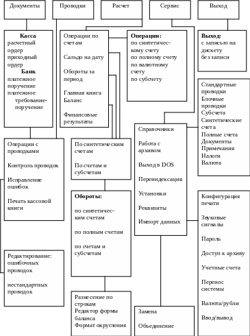 Система содержит пять основных разделов (см. рис. 2.1): документы, проводки, расчет, сервис, выход.