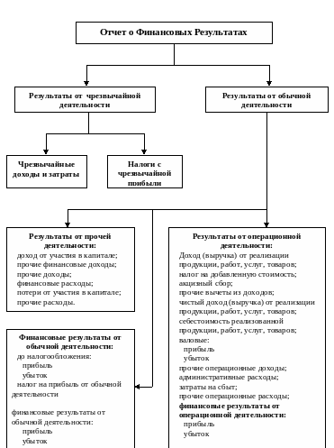 Отчет о финансовых результатах отражает всю деятельность предприятия отчетного периода и имеет структуру, представленную на схеме, приведенной ниже: