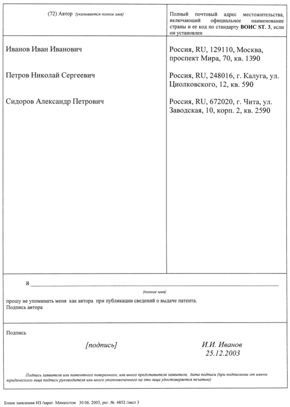 Графа, расположенная непосредственно под графой, имеющей код (72), заполняется только тогда, когда автор просит не упоминать его в качестве такового при публикации сведений о заявке и/или о выдаче патента. В этом случае приводятся фамилия, имя и отчество (если оно имеется) автора, не пожелавшего быть упомянутым при публикации, и его подпись.