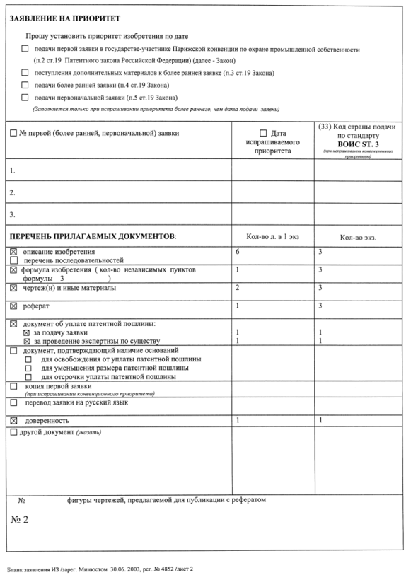 Графа "Перечень прилагаемых документов" на второй странице заявления заполняется путем простановки знака "X" в соответствующих клетках и указания количества экземпляров и листов в каждом экземпляре прилагаемых документов. При наличии в описании изобретения раздела "Перечень последовательностей" в соответствующей графе указывается количество листов описания и листов перечня раздельно. Для прилагаемых документов, вид которых не предусмотрен формой заявления ("другой документ"), указывается конкретно их назначение. При наличии в заявке машиночитаемого носителя информации (дискеты) с записью копии перечня последовательностей нуклеотидов и/или аминокислот и заявления, предусмотренного подпунктом (4) пункта 2.5 настоящих Правил, в графе "другой документ" указывается "Заявление с дискетой". Если прилагаемые документы заявки содержат чертежи, после перечня документов приводится указание номера фигуры чертежей, предназначенной для публикации с рефератом.