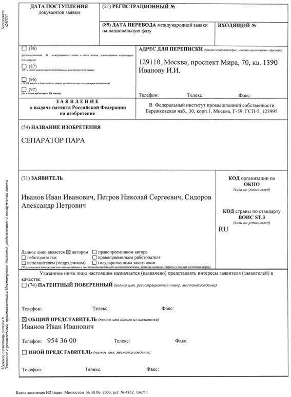 Образец заполнения бланка заявления о выдаче патента РФ (физ. лицо)