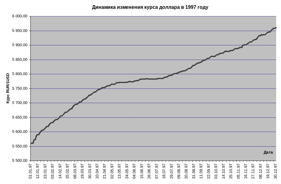 При определении параметров валютной политики в 1997 году Банк России использовал базовый макроэкономический прогноз, принятый для расчета федерального бюджета на 1997 год: прирост потребительских цен на 11,8% в течение года, реальный рост ВВП на 2% в течение года, дефицит федерального бюджета в размере 3,5% ВВП, финансируемый примерно поровну из внутренних и внешних источников. В 1997 году был сохранен принцип установления официального курса рубля по отношению к иностранным валютам через кросс - курсы этих валют к доллару США, поскольку доллар США является доминирующей валютой при расчетах России с остальным миром по торговым и неторговым операциям.