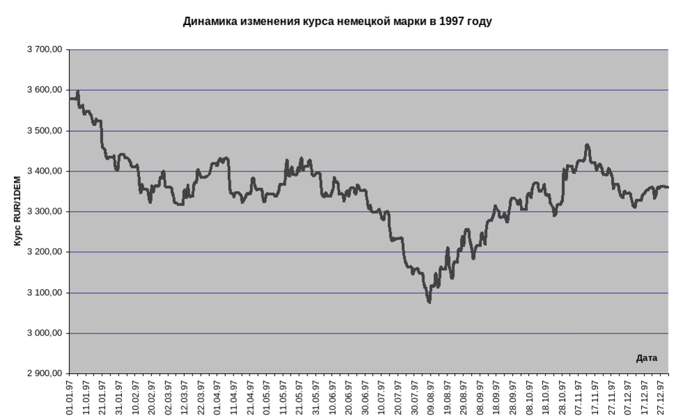 Начиная с 1995 года и по настоящее время Правительством РФ и Центральным Банком РФ, проводится политика, направленная на обеспечение стабильности национальной валюты, повышение конкурентоспособности отечественной промышленности на внутреннем и международном рынках, создание условий для привлечения иностранных инвестиций и «дедолларизацию» экономики страны. Помимо развития и укрепления законодательной базы, на каждый год определяется область изменения официального курса рубля путем установления официального курса российского рубля к иностранным валютам, основанного на ежедневных котировках Банка России. При этом Банк России ограничивает колебания валютного курса на биржевом и межбанковском валютном рынках, устанавливая официальный валютный курс и курсы покупки и продажи валюты по операциям Банка России в определенных пределах (от 5500 и 6100 рублей за доллар США на 1 января 1997 г. до 5750 и 6350 рублей за доллар США на 31 декабря 1997 г.) Данный механизм регулирования курсов иностранных валют основан на гарантированной возможности беспрепятственной покупки и продажи иностранной валюты на внутреннем валютном рынке в рамках действующего законодательства и мерах бюджетной, денежно-кредитной и валютной политики.