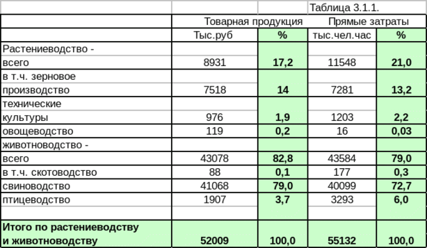 Так, если объем реализации свинины занимает 79% от общего объема, то затраты труда - 72,7% от общей суммы затрат труда, по зерну 14 и 13% соответственно.