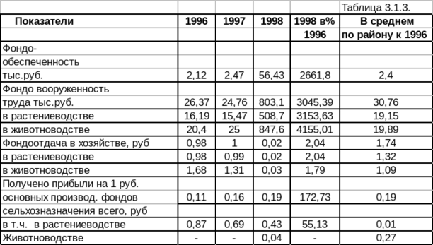 Фондовооруженность труда работников и фондообеспеченность хозяйства в 1998 году значительно возросли, по сравнению с предыдущими годами, в то же время фондоотдача сократилась и составила 0,02.
