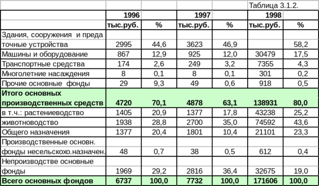 Как явствует из данных, приведенных в таблице 3.1.2. на 1 января хозяйство располагало основными средствами на сумму 171606 тыс.рублей. Наибольшую часть 3/4 от всего имущества занимают основные средства сельскохозяйственного назначения. За последние три года наметилась тенденция к увеличению удельного веса основных средств сельскохозяйственного назначения.