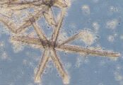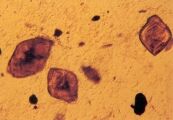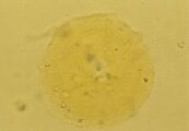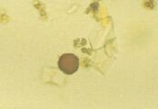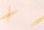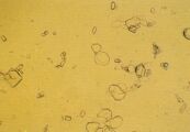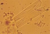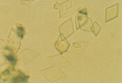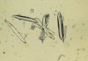 Кристаллы мочевой кислоты часто встречаются желтого или желто-коричневого цвета различных форм. Наиболее характерная форма - алмаза или ромбической пластины с концентрическими кругами (рис. 57-61). Также они могут встречаться в виде розеток, состоящих из нескольких агрегированных кристаллов мочевой кислоты. Иногда они встречаются как ромбические пластины с одним или несколькими парными выступами по бокам (рис. 62-63). Гораздо реже они встречаются в форме шестигранных кристаллов, напоминая цистин. Однако, шестигранные кристаллы всегда встречаются вместе с типичными кристаллами алмазной или ромбовидной формы. Кристаллы мочевой кислоты растворимы в гидроксиде натрия, но нерастворимы в спирте, соляной кислоте и уксусной кислоте.