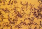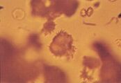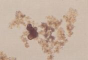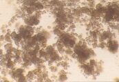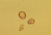 Соли уратов натрия, калия, магния могут преципитировать в виде аморфных образований в кислой моче (так называемые аморфные ураты). Они могут напоминать аморфные фосфаты (рис. 49), но способны растворяться в щелочной среде. При росте аморфных кристаллов (рис. 47-51) они приобретают желтую или желто-коричневую окраску. Ураты натрия могут преципитировать как бесцветные или желтоватые иголочки или как тонкие призмы в связке или пучках (рис. 52-56). Ураты аммония и аморфные кристаллы урата нерастворимы в кислой моче. Однако, добавление 10% уксусной кислоты в мочевой осадок, содержащий эти кристаллы, часто приводит к выделению мочевой кислоты и иногда кристаллов натрия урата. Добавление уксусной кислоты к аморфным кристаллам фосфата приводит к их быстрому растворению, в то время как они продолжают сохраняться в осадке щелочной мочи.