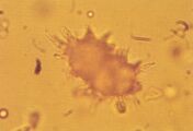 Кристаллы урата аммония (также наываемые биурата аммония) обычно обнаруживаются в слегка закисленной, нейтральной или щелочной моче. Они, как правило, желтого или желто-коричневого цвета, сферической формы с длинными иррегулярными выступами (так называемое колючее яблоко) (рис. 43-51).