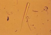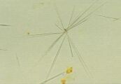 Тирозиновые кристаллы обнаруживаются как рефрактерные, бесцветные или желтые игольчатые кристаллы, расположенные группами (рис. 42). У людей они встречаются при тяжелых заболеваниях печени.