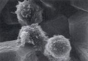 ис. 50. Сканированная электронная микрофотография аморфных кристаллов аммония урата, смежных с кристаллами мочевой кислоты в закисленном мочевом осадке собаки, описанной в рис. 49 (увеличение Х 5,400).
