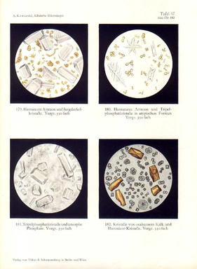 Оксалаты - щавелевокислый кальций (Са (СаС2О4 3H2O)) встречается в виде прозрачных кристаллов в форме октаэдров, которые при ближайшем рассмотрении похожи на “почтовые конверты”. Реже, имеют форму кольца, песочных часов или гантелей, иногда могут напоминать гиппуровую кислоту (О. Жоне 1999). Гиппуровая кислота имеет форму призм и игл.