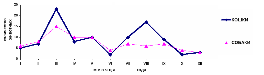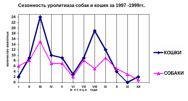 РАФИК СЕЗОННОСТИ УРОЛИТИАЗА В ГРУППЕ КОШЕК И СОБАК ЗА 1997-1999гг.