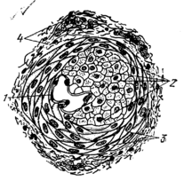 1 — эндотелий; 2 — продольно расположенные эпителиоидно-мышечные клетки; 3 — циркулярно расположенные мышечные клетки средней оболочки;