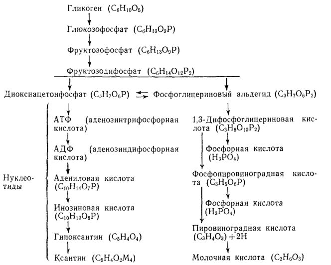 Люндсград показал, что креатинофосфорная кислота находится в мышечных клетках и при сокращении их расщепляется на креатин и фосфорную кислоту (по Палладину), которая соединяется с гексозой (глюкозой). Аденозинофосфорная кислота, содержащаяся в мышцах, также расщепляется с образованием аденозина и фосфорной кислоты, которая дри соединении с гексозой (глюкозой) способствует образованию молочной кислоты (Эмбден и Цимммерман).