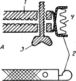 Наиболее трудоемким в процессе операции является наложение ушного зажима, так как при этом кожу раковины необходимо максимально сдвинуть к ее основанию и в таком положении зажать по линии ампутации. При использовании винтовых ушных зажимов без помощника это сделать трудно. Процедуру можно упростить с помощью разработанного в Костромском СХИ специального зажима (рис. ). В нем каждая из пластин 1 на концах имеет рукоятку 2, которая дважды отогнута под прямым углом в плоскости зажима. Поэтому при сжатии пластин винтом 3 рукоятки перекрещиваются, а свободные концы их располагаются параллельно. Между ними укреплена пружина 4, разжимающая рукоятки и сжимающая пластины зажима. На внешней поверхности пластин нанесены риски, служащие для измерения ампутируемой части ушной раковины, а на внутренней имеются насечки.