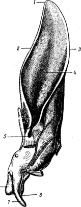 Наружная поверхность раковины образует спинку раковины - dorsum auriculae, а внутренняя поверхность — ладьевидную ямку — fossa scaphoidea. В нее ведет обширная ушная щель— fissura auriculae, ограниченная двумя краями: передним, более или менее прямым, и задним, выпуклым, — margo auriculae nasalis et caudalis. Оба края сходятся дистально на верхушке ушной раковины – apex auriculae, а проксимально, т. е. ближе к черепу, в спайке ушной раковины – commissura auriculae. Ладьевидная ямка переходит в ямку завитковой части – fossa conchae, а последняя — в наружный слуховой проход.