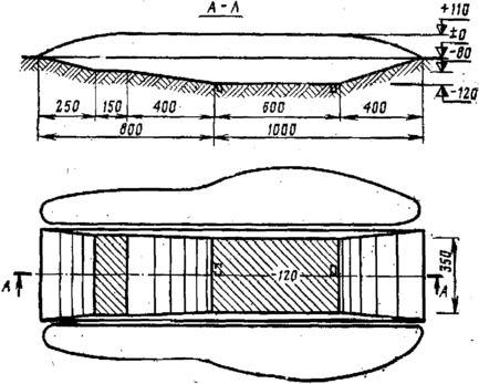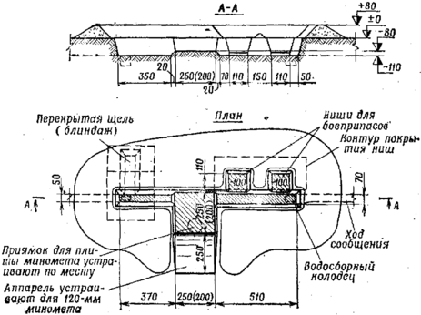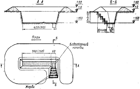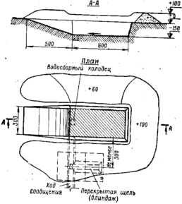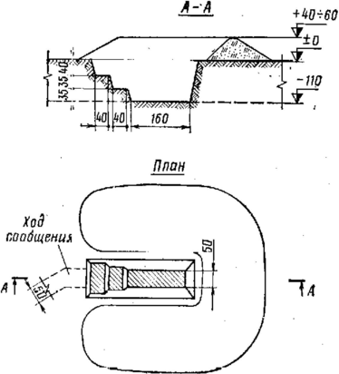 Объем вынутого грунта со входом с поверхности 7(5,5)м3, со входом из траншеи 6(4,5) м3. На устройство щели со входом с поверхности требуется 12(10)чел.-час., о входом из траншеи 8(6) чел.-час., круглого леса 0,1 м3