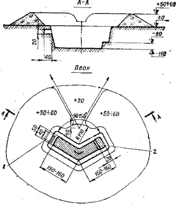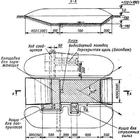 | Артиллерийская система | Размеры, м. | Вынутый грунт, м3 | Требуется чел.-час | |