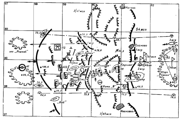 Районы расположения (сосредоточения), исходный район соединения, части и подразделения. Планируемый район обозначается пунктирной линией.