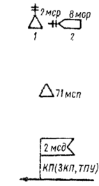 Командно-наблюдательный пункт роты: 1 - в обороне и в пешем порядке в наступлении; 2 - в движении на БМП (на другой технике - с соответствующим знаком). Командно-наблюдательный пункт взвода - с одной черточкой.