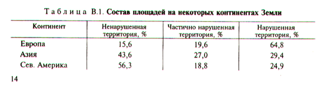 Данные таблицы показывают, что на планете осталось мало территории с ненарушенными экосистемами. В наибольшей степени экосистемы разрушены в развитых странах - в Европе, Северной Америке, Японии. Здесь естественные экосистемы сохранились в основном на ограниченных площадях, они представляют собой небольшие пятна биосферы, окруженные со всех сторон нарушенными деятельностью человека территориями и поэтому подвержены сильному техносферному давлению.